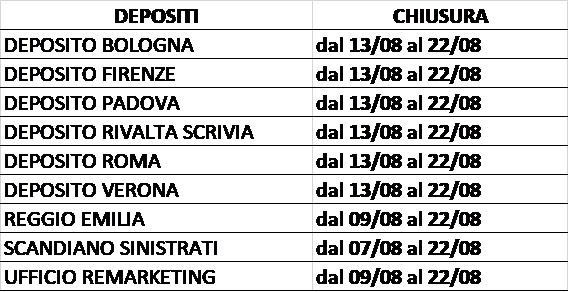 di seguito le date di chiusura dei depositi delle vetture.